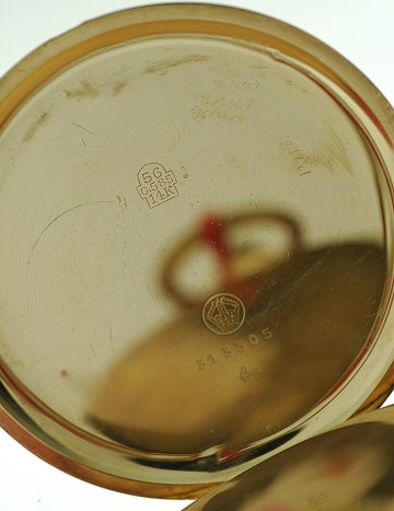 Dobbeltkapslet lommeur i 14 kt. guld, diam. 54 mm vægt: 104 gr. med skilt fra ABR auktion 446 lot nr. 2466