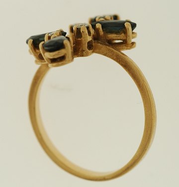 Ring af guldholdigt metal prydet med diamanter og mørke blå sten. vægt: 4,6 gr. str. 56