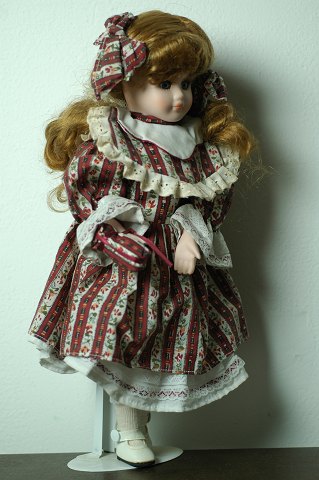 Håndmalet porcelænsdukke med kjole, bukser og lædersko. H. 40 cm - The Leonardo Collection