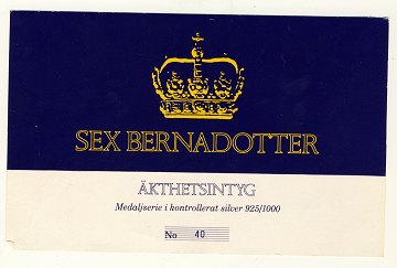 Seks Bernadotte medaljer i sterling sølv med portrætter af Carl XIV Johan, Oscar I, Carl XV, Gustaf V og Gustaf VI Adolf. Certifikat og trææske medfølger. Vægt: 325 gr.