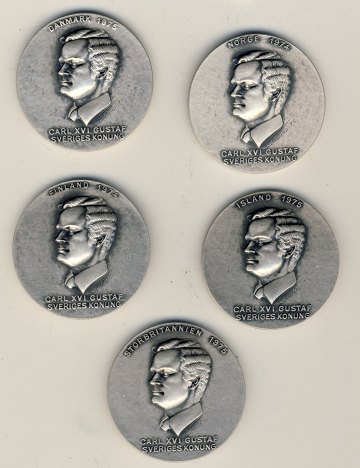 5 mindemedaljer i sølv i anledning af Carl XVI Gustafs besøg i hhv Danmark, Norge, Island, Storbritannien og Finland. samlet vægt: 125 gr.