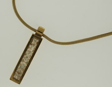 Vedhæng af guld 18 kt prydet med 6 diamanter i princess slib - ialt ca. 0,60 ct. - medfølgende kæde af guld 14 kt - vægt ialt 9,5 gr.