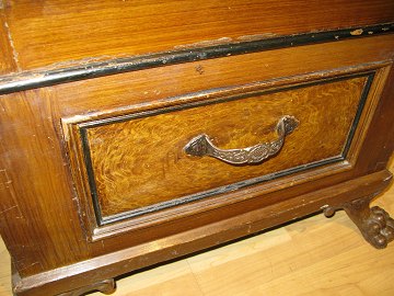Gammelt pengeskab i jern med fod og top i træ. Skabet står løst på foden og toppen kan tages af. Der medfølger 2 nøgler til boksdøren og en nøgle til det indvendige ekstra rum.