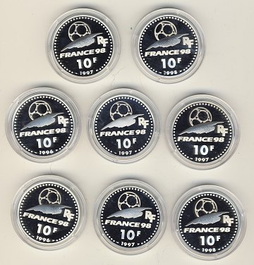 8 sølvmønter fra VM 98 i Frankrig. Lækker æske medfølger. Total vægt ca.: 200 gr.
