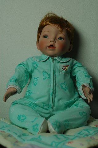 Håndlavet porcelænsdukke, med tøj og medfølgende tæppe. Dukken er fra Pooh Patchwork collection. I original emballage og med certifikat. H.32 cm