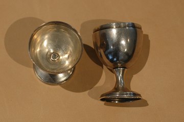 Russiske sølv æggebægre, som kan skrues fra hinanden og samles til et lille æg. H. 6,5 cm Vægt: 85 gr.