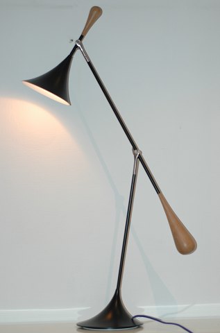 Justérbar bordlampe, designet af Terence Conran, model Beep, udført i sort metal, med håndtag i egetræ. Ubrugt og i original emballage.