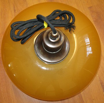PH Poul Henningsen (1894-1967). Pendel med fatningshus af bruneret messing, monteret med skærmsæt af ravfarvet glas. Stemplet PH-3, Patented. Udført hos Louis Poulsen i begyndelsen af 1930'erne.