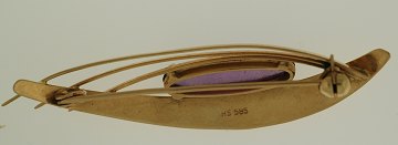 Broche af guld 14 kt. prydet med ametyst. L. 54 mm vægt: 4,5 gr.