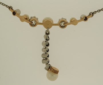 Halssmykke i guldholdigt metal prydet med brillanter samlet ca. 0,75 ct. og perler. L.38,5 cm Vægt: 7,8 gr.