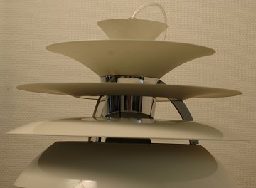 Poul Henningsen (1894-1967) PH, Kuglelamel med hvidlakerede lameller, stel af forkromet aluminium. Fremstillet hos Louis Poulsen, H. 39 cm Diam. 40 cm, hvid stofledning.