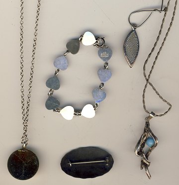 Lot sølvsmykker: lille hjertearmbånd i sterling sølv, 2 kæder med vedhæng i hhv sterling og 830 sølv, broche og kæde i sterling.