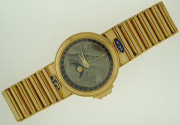 Urkasse og lænke i 18 kt guld, lynetten indgraveret "Corum" & "Meteorite Peary", uret er nummereret "85". Automatisk urværk. Certifikat fra 1989 medfølger. Diam. 36 mm vægt: 156 gr.