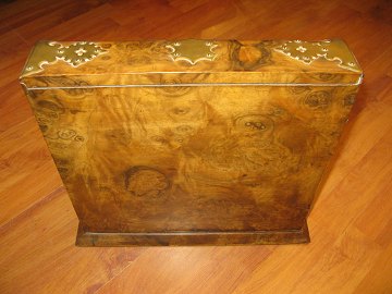 Tantalus i træ med beslag af messing, 3 flasker i krystalglas, skuffe m. nøgle. Mål: 32 x 33 x 24 cm