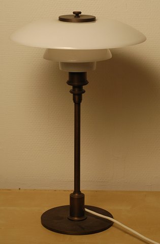 PH Poul Henningsen (1894-1967) 3/2 bordlampe i bruneret messing, skærme af mundblæst hvidt opal glas, monteret med uoriginal plastledning uden afbryder. H. 47,2 cm. Diam. 29 cm
