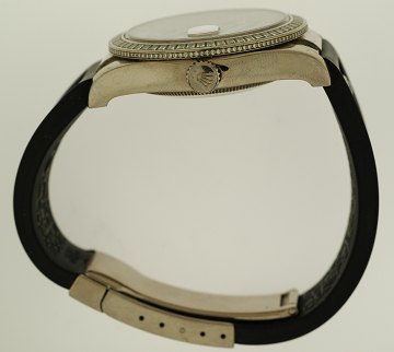 Diamantbesat rem i læder af pilrokke og gummi m. oysterclasp, diamantbesat skive, rand besat med baguettediamanter.