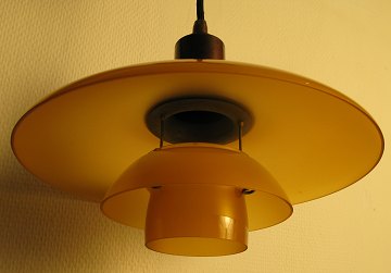 PH Poul Henningsen (1894-1967). Pendel med fatningshus af bruneret messing, monteret med skærmsæt af ravfarvet glas. Stemplet PH-3, Patented. Udført hos Louis Poulsen i begyndelsen af 1930'erne.