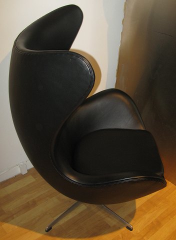 Arne Jacobsen (1902-1971), Ægget i sort læder, ægget er placeret på en profileret fod med drejefunktion, skallen formet af fiberglasforstærket kunststof med skumpolstring. H. 105 cm B. 79 cm
