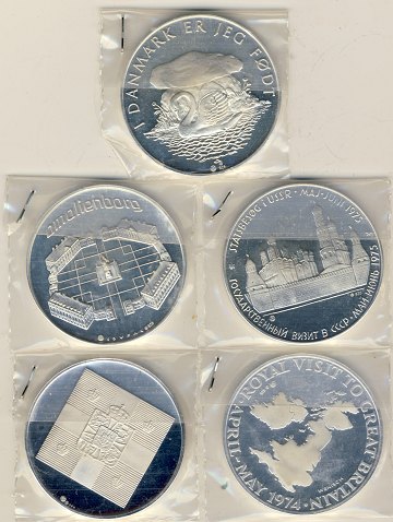 5 mindedukater i sterling sølv, samlet vægt: 120 gr. str. 44 mm i diam. Alle medaljerne kommer med certifikat og hylster.