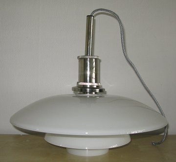 PH Poul Henningsen (1894-1967) 4½-4 pendel med skærme af mundblæst hvidt opal glas, lille afblændingskærm i aluminium og fatningsskjuler i forkromet aluminium. H. 41 cm. Diam. 48 cm
