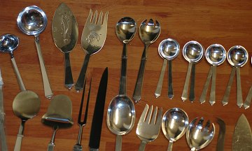 1 serveringsske, 4 smørknive, stor kageske, kageske, ske til canapé, kagekniv, salatske og gaffel, forskærerkniv og gaffel, suppeske, fiskeanretterske og gaffel, ostehøvl og kniv, flaskeåbner, serveringsske og gaffel, stor serveringsske + gaffel, 2 pålægsgafler.