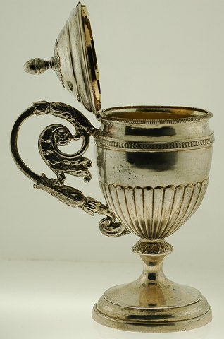 Sennepskrukke af sølv, indvendigt forgyldt, formentlig første halvdel af det 19. århundrede. H. 135 mm Vægt: 113 gr.