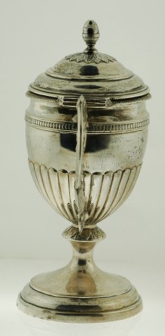 Sennepskrukke af sølv, indvendigt forgyldt, formentlig første halvdel af det 19. århundrede. H. 135 mm Vægt: 113 gr.