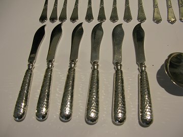 Kartoffelske i 3-tårnet sølv, 7 kaffeskeer i pletsølv, 17 kagegafler i pletsølv, kagespade i pletsølv, 6 smørknive i pletsølv.