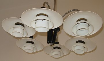 Poul Henningsen(1894-1967), Bombardementskrone med seks arme, stel af forkromet messing, fatningshuse af brun bakelit, monteret med 2/1 skærmsæt i opal glas. Fremstillet hos Louis Poulsen. Ø 60 cm.