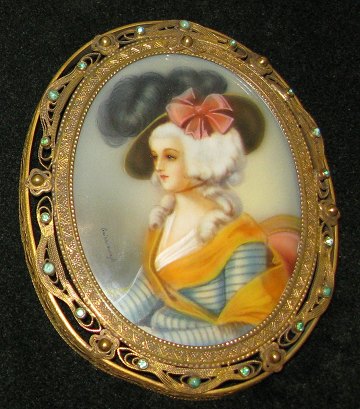 Miniature malet på elfenben, ovalt portræt af dame efter Thomas Gainsborough, i ramme af messing. H. 10,8 cm B. 8,8 cm