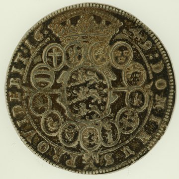 Frederik III, Speciedaler 1649, Hede 50 B - den bedre type med 13 provinsvåben. Særdeles nydeligt eksemplar med en mørk patina som desværre synes ekstra mørk på billedet, så mønten ikke helt får det rette udseende.