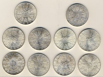 Østrig, 10 forskellige 25 schilling i sølv -