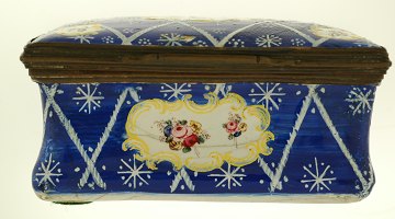 Æske med emalje-arbejde, dekoreret med blåt mønster og blomster. H. 40 mm L. 84 mm B. 55 mm