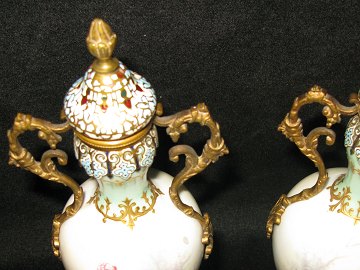 A pair of vases with brass handles and base and cloisonne.