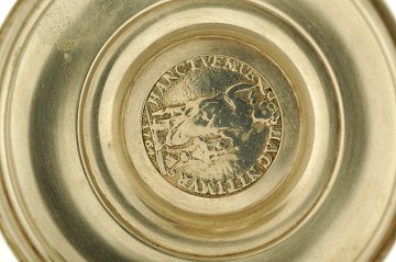 Lågkrus af sølv, monteret med 3 mønter. Norge 4 mark 1682 (sjældent år), Danmark Speciedaler 1808 samt Holland 3 gulden 1764.