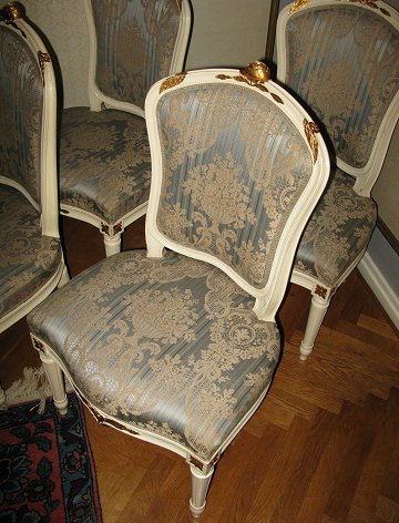 Fire stole i hvidmalet træ med gulddekoreringer. Gustaviansk form. Sædehøjde 41 cm ryg 89 cm b. 52 cm