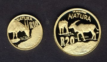 Sydafrika, 20 Rand og 10 Rand GULD 2007, Hhv. 1/4 ounce og 1/10 ounce finguld. Skjult i træholder udformet som kudu.