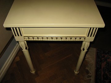 Bord af hvidmalet træ med guld, gustaviansk form. H. 71 cm l. 93 cm b. 53,5 cm