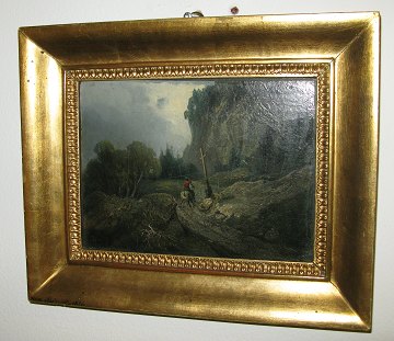 Binoit 1800-tallet, klippelandskab med en rytter ved et kors, sign. Binoit, str. 15,5x20 cm