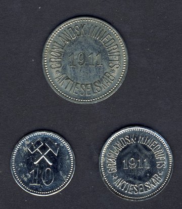 Grønlandsk Minedrift, komplet sæt 1911, 10-25 og 100 øre