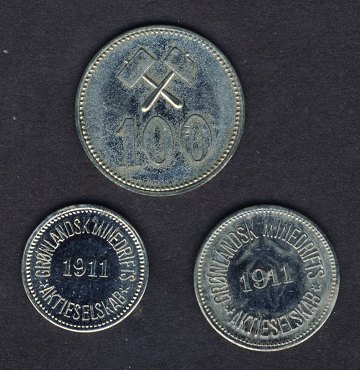 Grønlandsk Minedrift, komplet sæt 1911, 10-25 og 100 øre