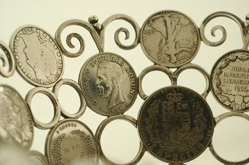 Skål af sølv, sammensat af talrige sølvmønter fra hele verden. H. 11,6 cm diam. 20 cm vægt: 816 gr.