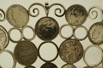 Skål af sølv, sammensat af talrige sølvmønter fra hele verden. H. 11,6 cm diam. 20 cm vægt: 816 gr.