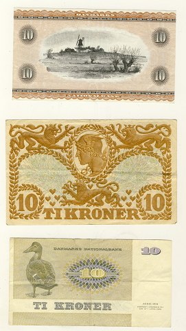 Samling danske 10 kr. sedler (3) 10 kr. 1974, 1978 og 1943