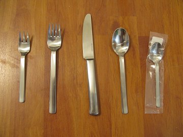 Georg Jensen, Bo Bonfils, 29 bestikdele i stål. 6 spiseknive, 5 spiseskeer, 1 dessertske, 7 teskeer, 7 kagegafler, 1 spisegaffel, 1 suppeske og 1 serveringsske.
