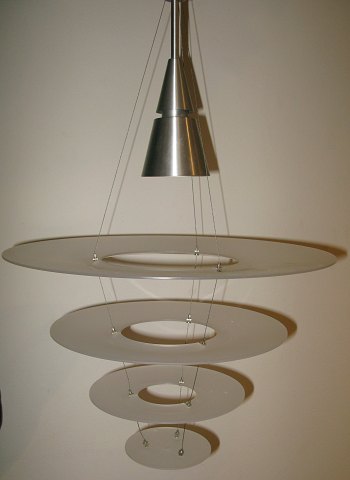 Enigma 425 pendel designet af Shoichi Uchiyama for Louis Poulsen. Fatningshus i børstet og lakeret aluminium, skærme i plast. H. 74 cm Diam. 42 cm