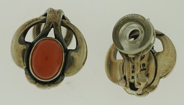 Georg Jensen øreclips i sterling sølv med koralfarvet sten. Æske fra Hingelberg medfølger.