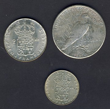 Lot sølv mønter (3) sølvdollar 1922, 2 kr. 1964 og 1 kr. 1963.