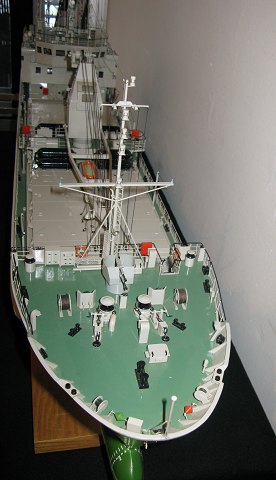 Stort modelskib i metal og træ, formentlig vesttysk militært skib til transport af ammunition.