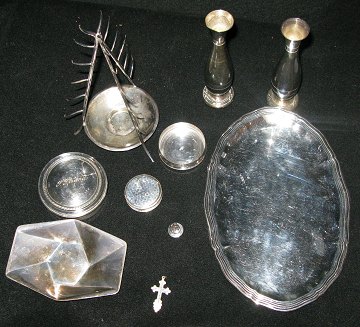 Lille lot blandet sølv og sølvplet. Det lille stativ er af sølv, de resterende dele er plet. Sølvvægt: 71 gr.